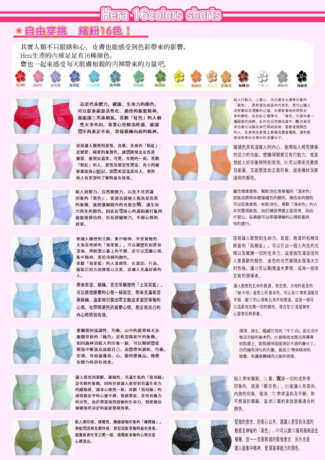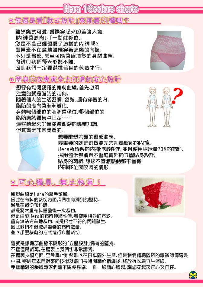 其中Hera美感舒適的女性蕾絲內褲,不同於坊間的蕾絲內褲以裝飾為主軸,Hera蕾絲內褲成份採用高品質棉加上立體剪裁,不僅舒適美觀更能完整包覆臀部,加上多達16個美麗顏色的選擇,已經成為Hera公司註冊商標的商品。